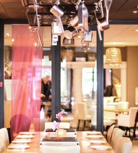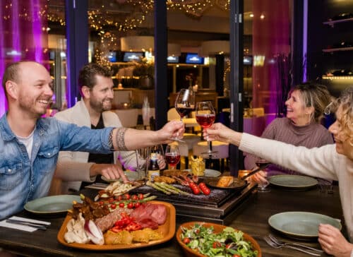 In onze steengrillzaal zit je gezellig met jouw gezelschap aan tafel, met in het midden de lavasteen. Hierop grill zelf je vlees en/of vis en groenten.